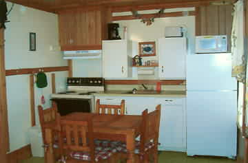 These 2 cabins each consist of one large room with 2 queen beds, full kitchen, and bathroom with a shower. These cabins comfortably sleep up to
